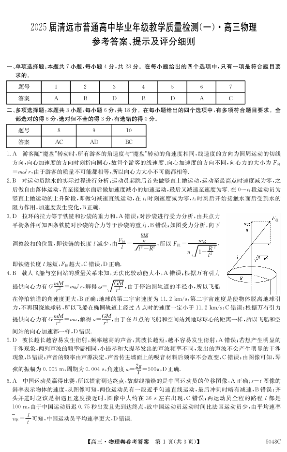 广东省清远市2024-2025学年高三上学期第一次模拟考试+物理答案