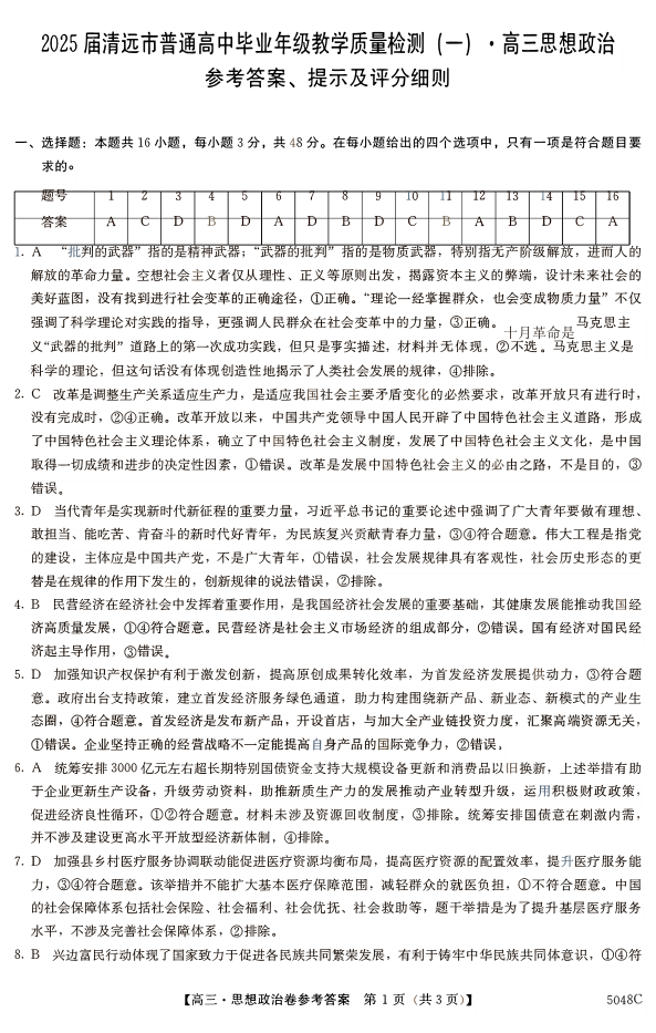 广东省清远市2024-2025学年高三上学期第一次模拟考试+政治答案