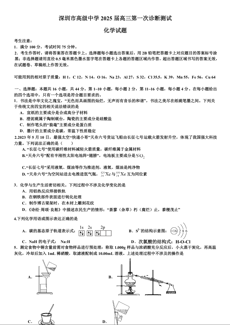 深圳市高级中学(集团)2025届高三第一次诊断考试+化学