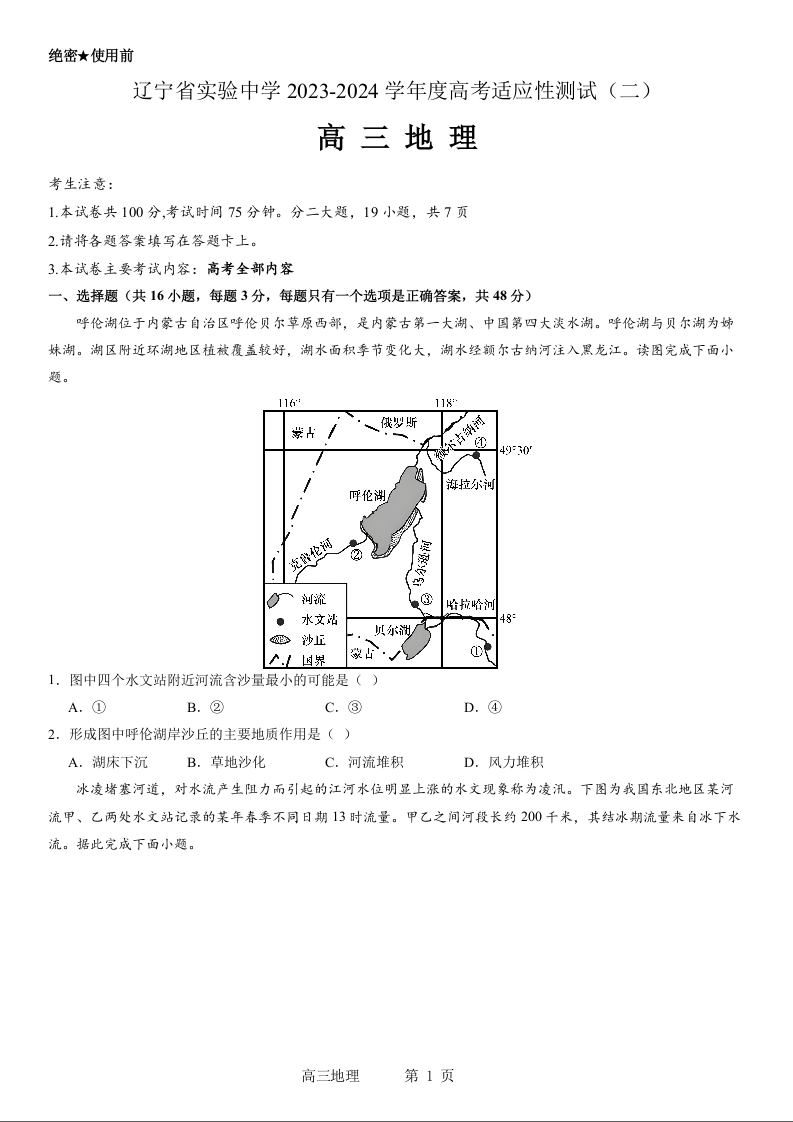 辽宁省实验中学2023-2024学年度高考适应性测试(二)地理
