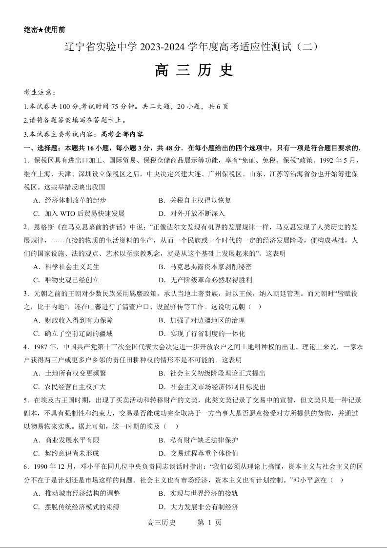 辽宁省实验中学2023-2024学年度高考适应性测试(二)历史