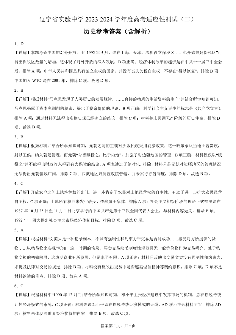 辽宁省实验中学2023-2024学年度高考适应性测试(二)历史参考答案