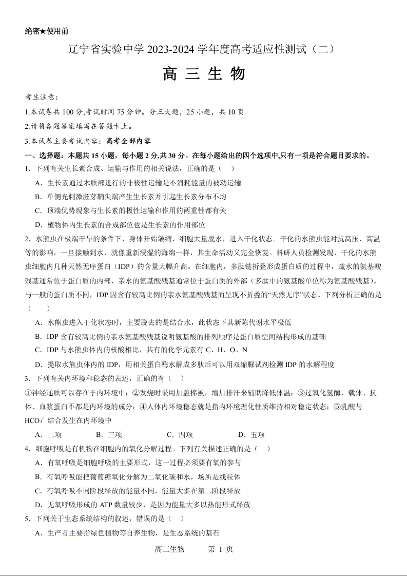 辽宁省实验中学2023-2024学年度高考适应性测试(二)生物