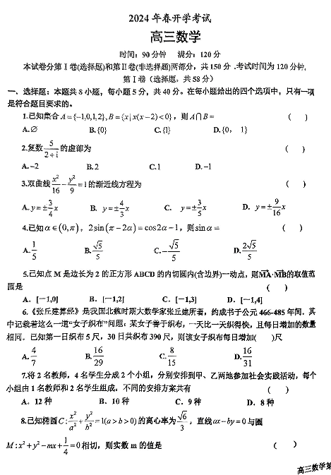 辽宁省辽东南协作体2023-2024学年高三下学期开学考试 数学