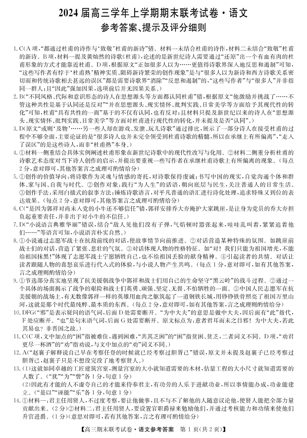 辽宁省朝阳市建平县2023-2024学年高三上学期期末联考 语文答案