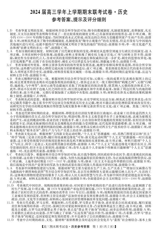 辽宁省朝阳市建平县2023-2024学年高三上学期期末联考 历史答案