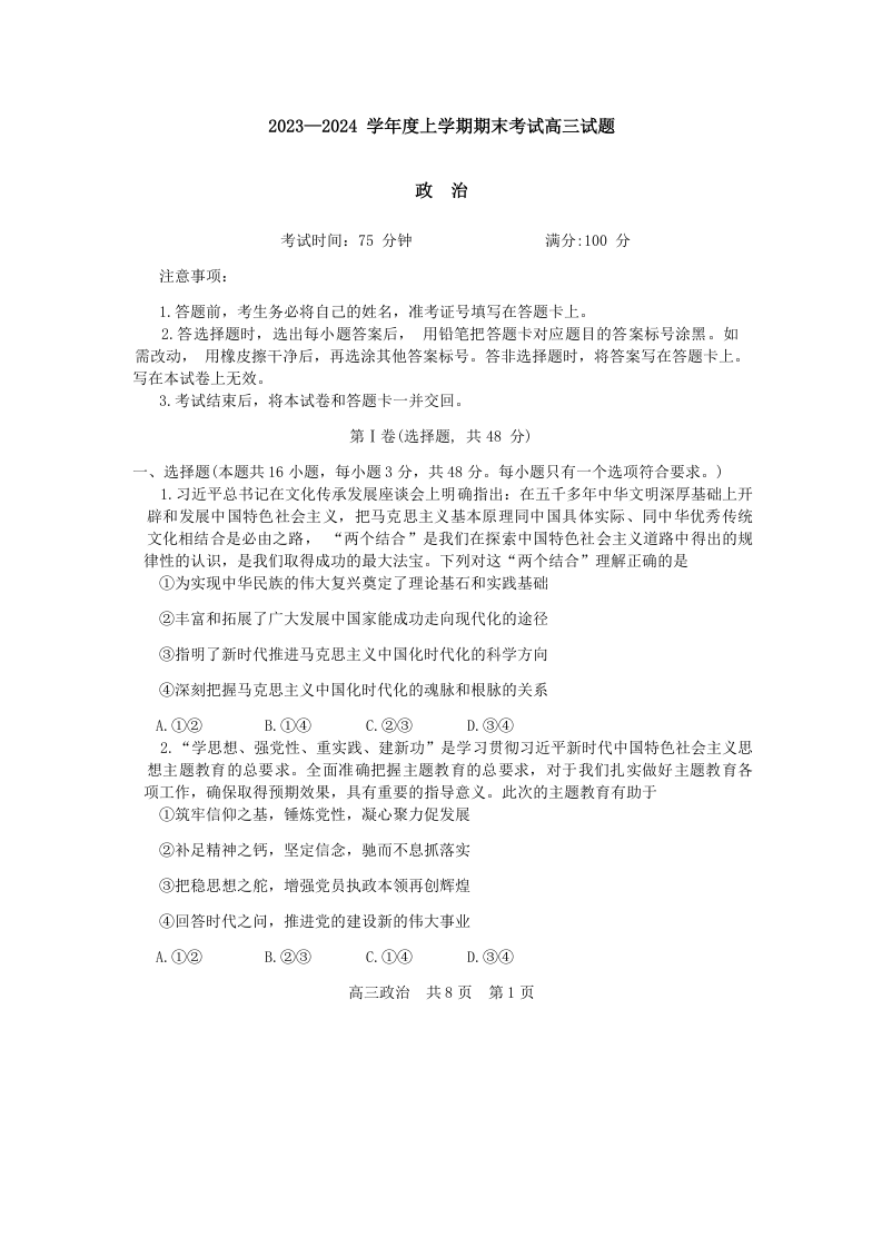 辽宁省协作校2023-2024学年度高三上学期期末大联考 政治