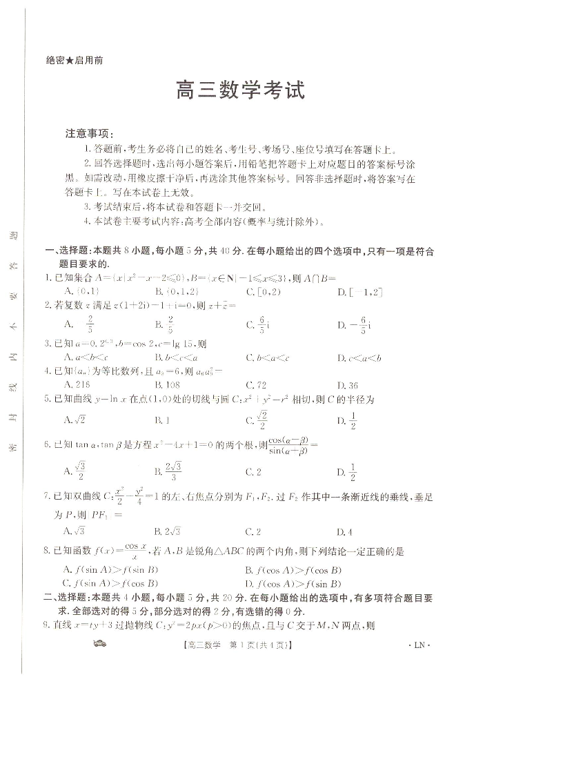 辽宁省抚顺市六校协作体2023-2024学年高三上学期期末考试 数学