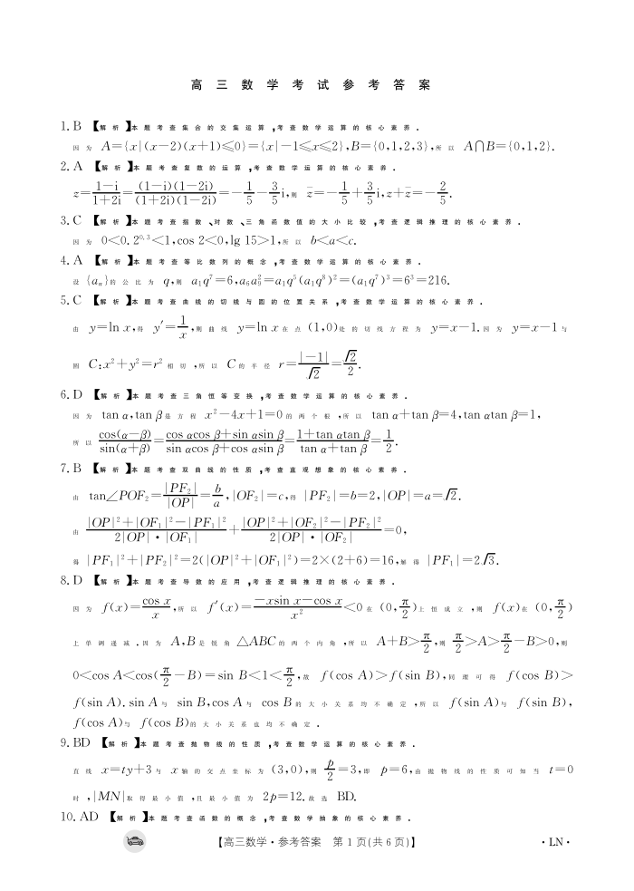 辽宁省抚顺市六校协作体2023-2024学年高三上学期期末考试 数学答案