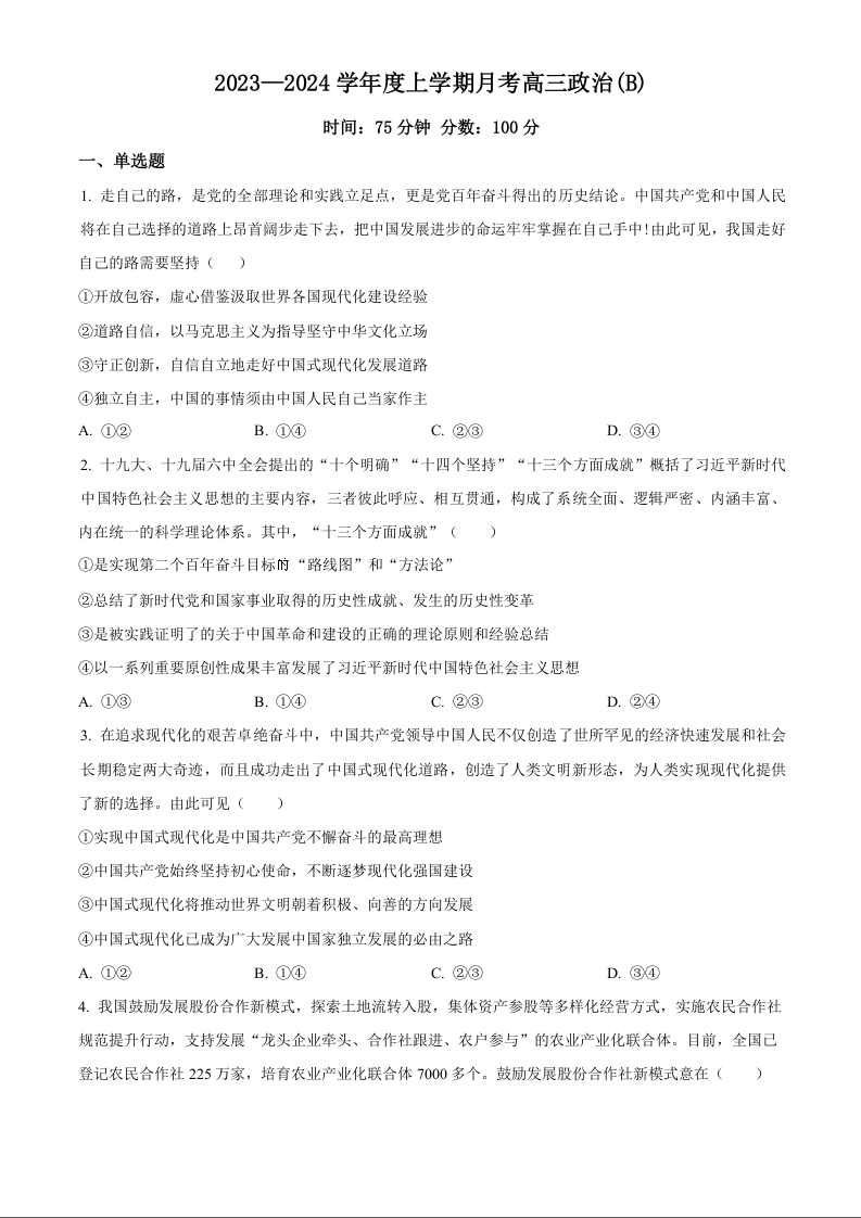 辽宁省辽东南协作校2023-2024学年高三上学期12月月考试题 政治