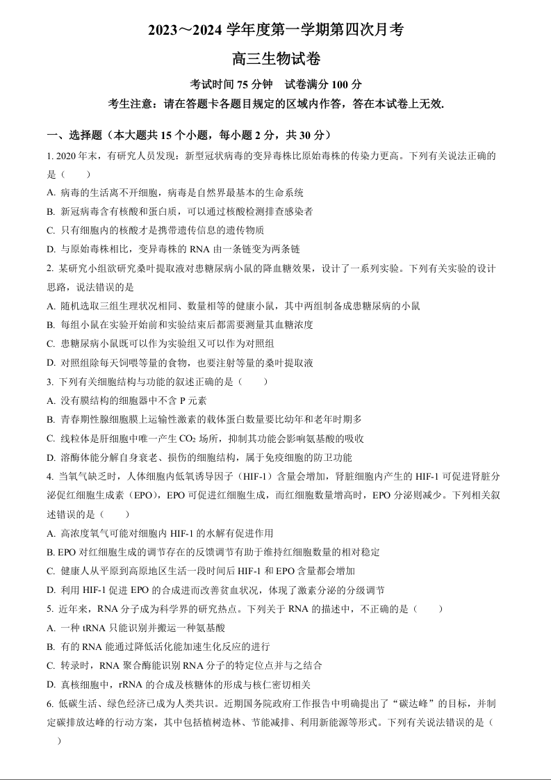辽宁省北镇市第二高级中学、第三高级中学2023-2024学年高三上学期第四次月考试题 生物