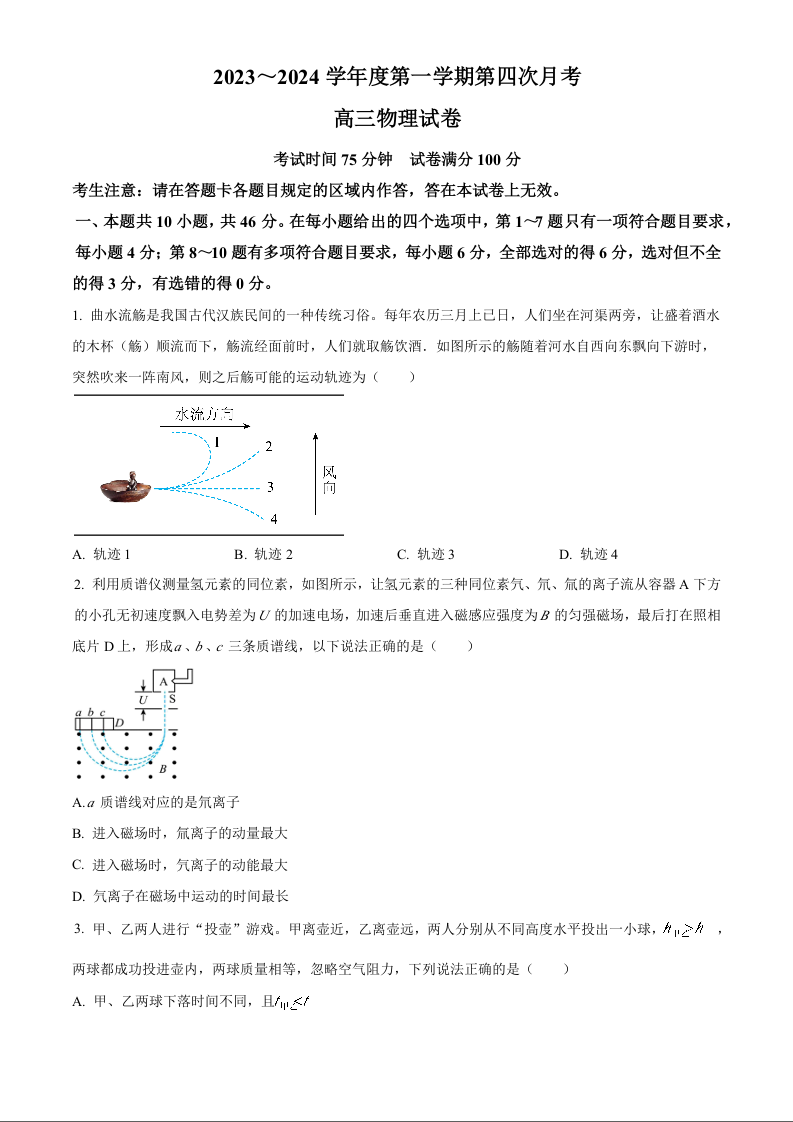 辽宁省北镇市第二高级中学、第三高级中学2023-2024学年高三上学期第四次月考试题 物理
