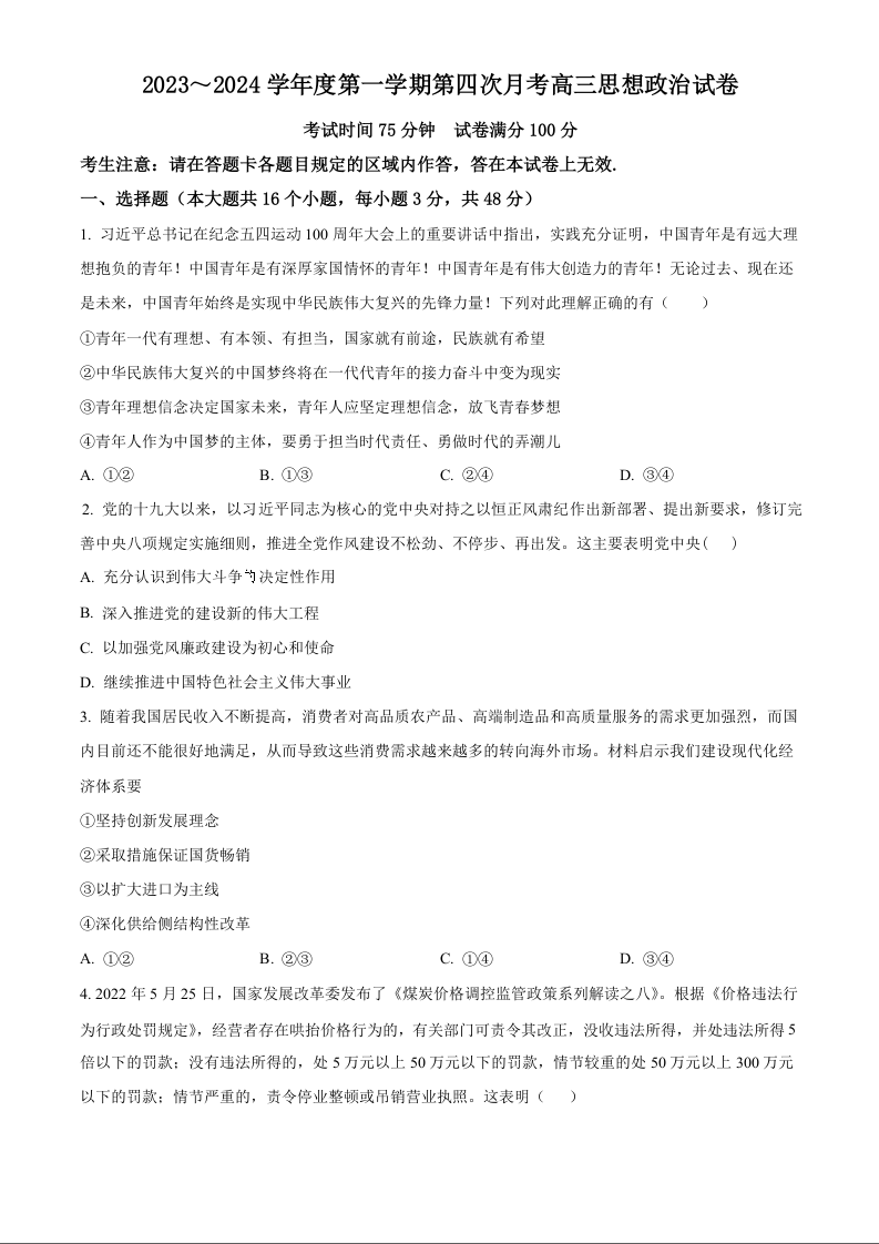 辽宁省北镇市第二高级中学、第三高级中学2023-2024学年高三上学期第四次月考试题 政治