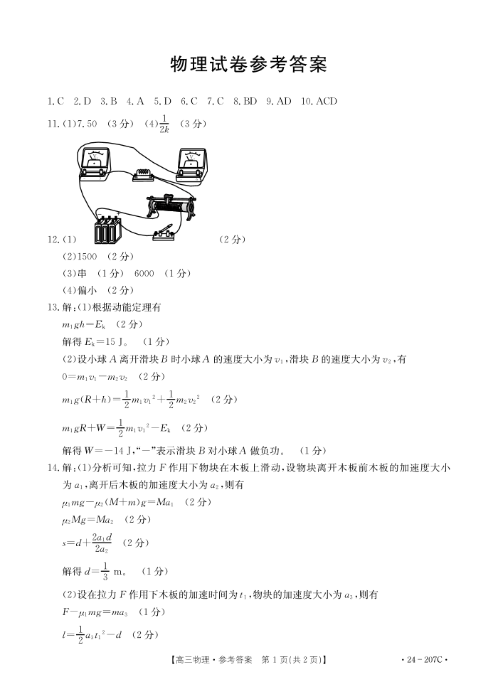 辽宁省部分学校2023-2024学年高三上学期12月考试 物理答案
