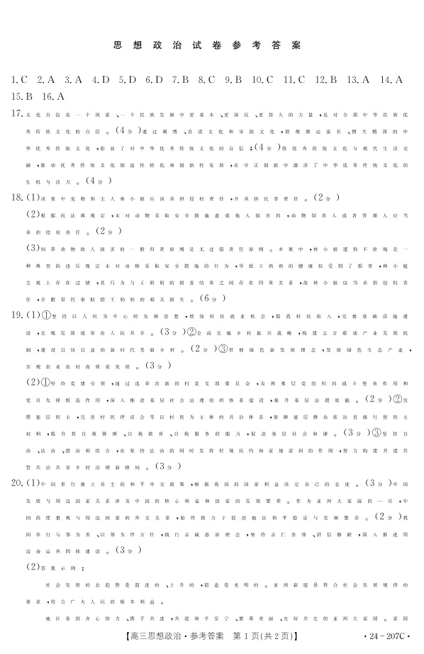 辽宁省部分学校2023-2024学年高三上学期12月考试 政治答案