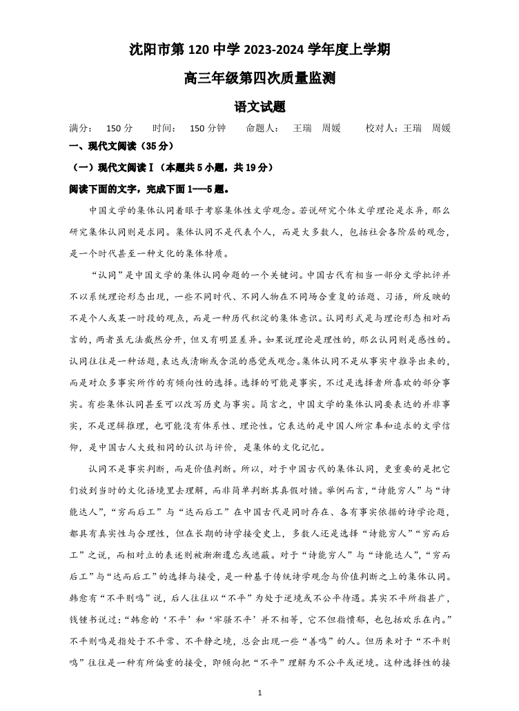 辽宁省沈阳市第一二〇中学2023-2024学年高三上学期第四次质量监测 语文