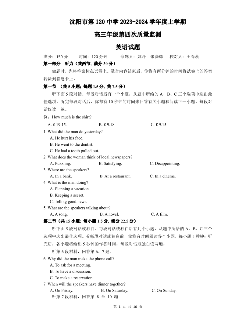 辽宁省沈阳市第一二〇中学2023-2024学年高三上学期第四次质量监测 英语