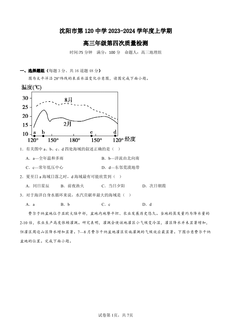 辽宁省沈阳市第一二〇中学2023-2024学年高三上学期第四次质量监测 地理