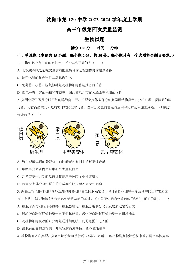 辽宁省沈阳市第一二〇中学2023-2024学年高三上学期第四次质量监测 生物
