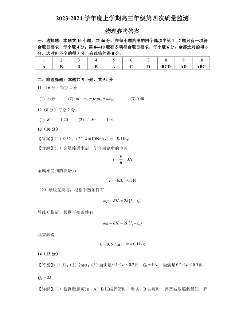 辽宁省沈阳市第一二〇中学2023-2024学年高三上学期第四次质量监测 物理答案