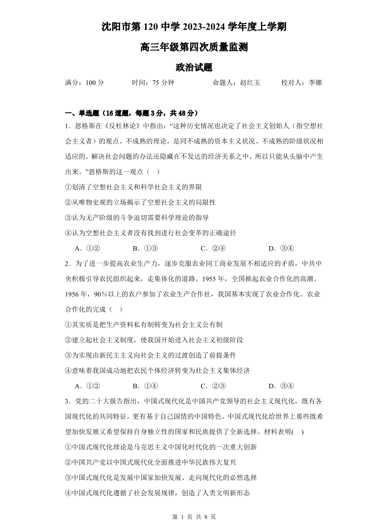 辽宁省沈阳市第一二〇中学2023-2024学年高三上学期第四次质量监测 政治