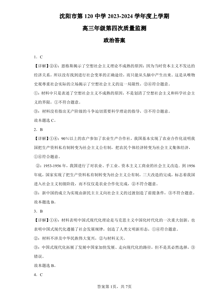 辽宁省沈阳市第一二〇中学2023-2024学年高三上学期第四次质量监测 政治答案