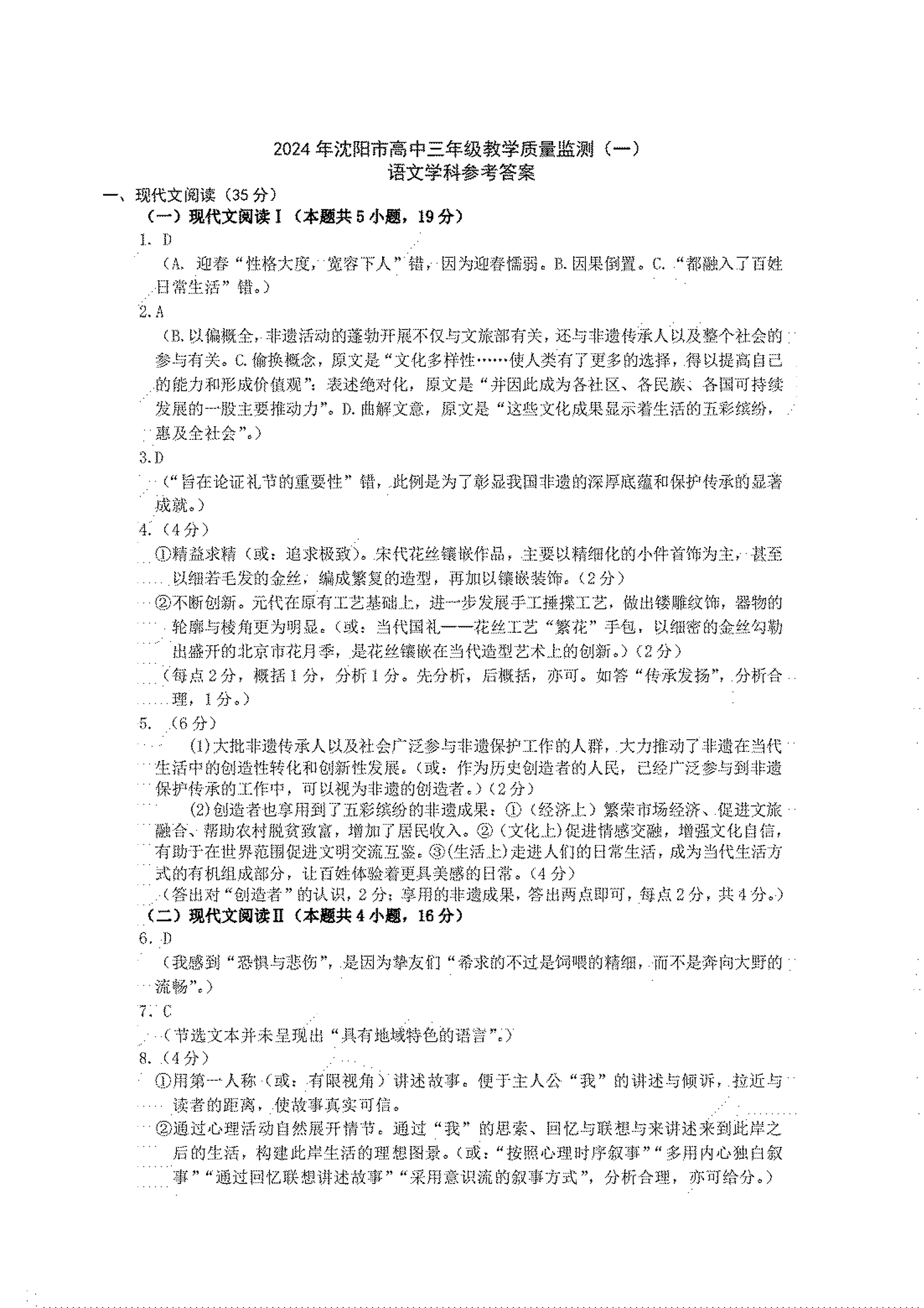 辽宁省沈阳市2023-2024学年高三上学期教学质量监测(一)语文答案
