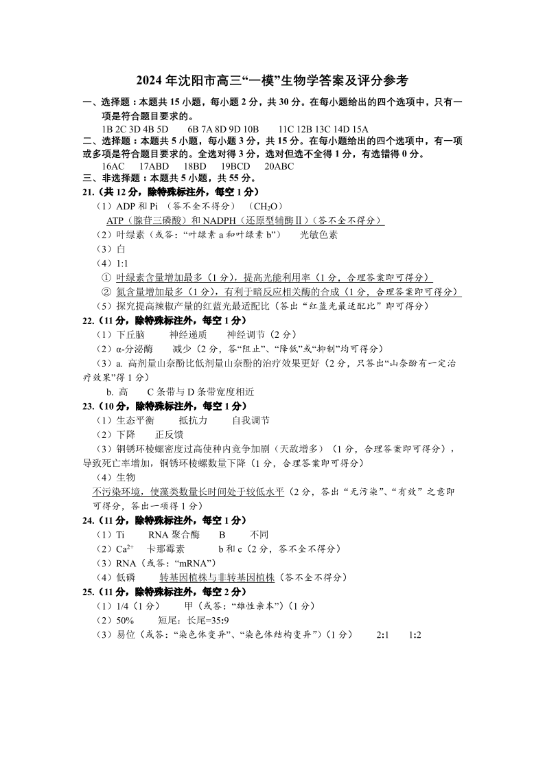 辽宁省沈阳市2023-2024学年高三上学期教学质量监测(一)生物答案