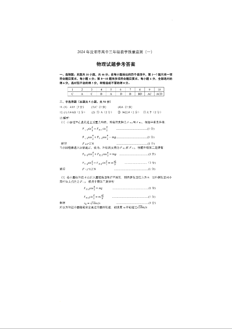辽宁省沈阳市2023-2024学年高三上学期教学质量监测(一)物理答案