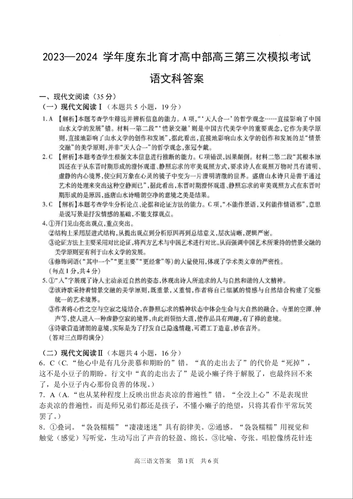 2023-2024学年度东北育才学校高中部高三第三次模拟考试 语文答案
