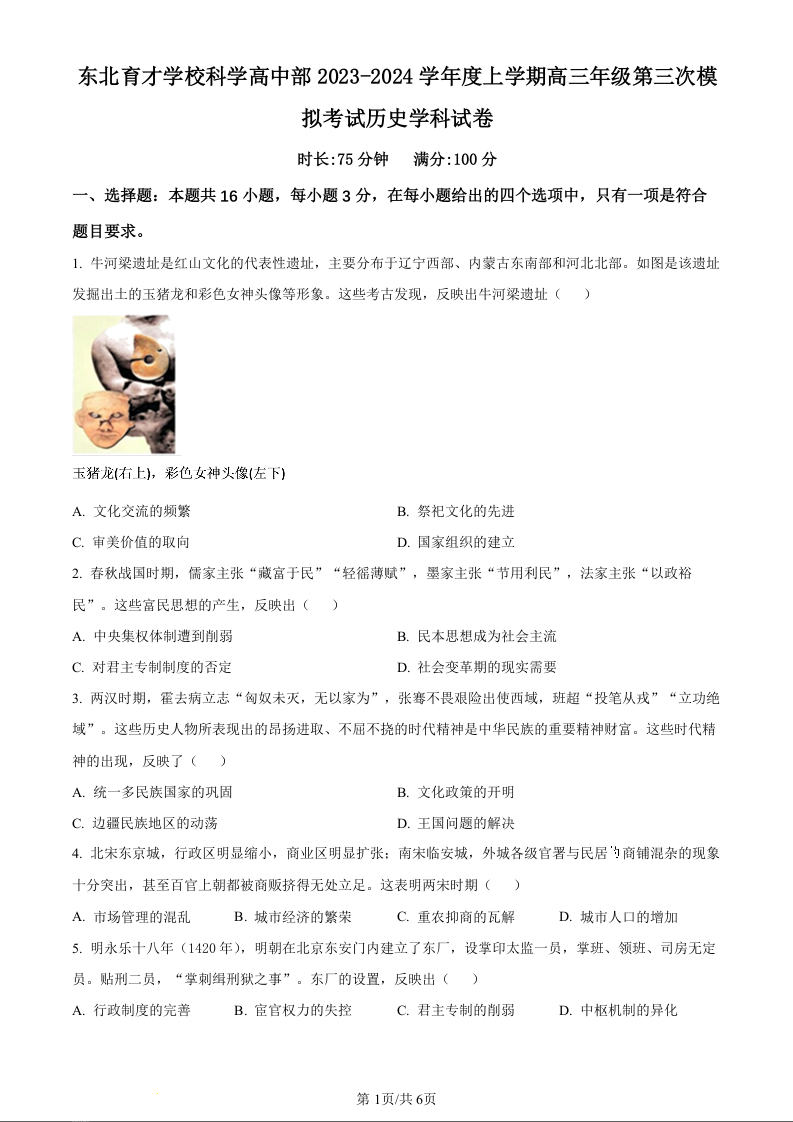 2023-2024学年度东北育才学校高中部高三第三次模拟考试 历史