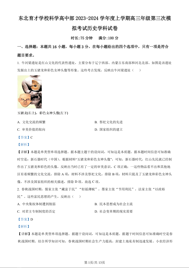 2023-2024学年度东北育才学校高中部高三第三次模拟考试 历史答案
