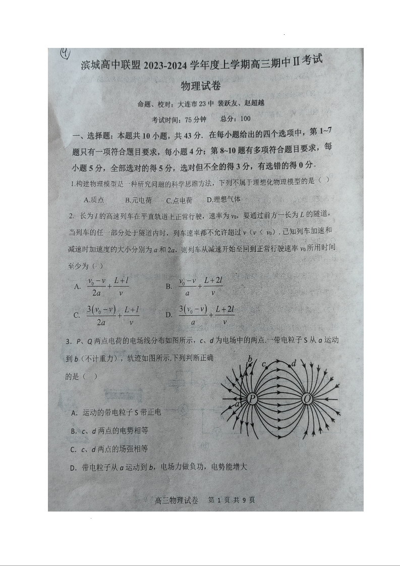 辽宁省大连市滨城高中联盟2023-2024学年高三上学期期中(Ⅱ)考试 物理