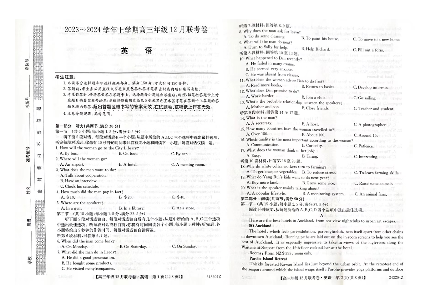 辽宁省部分学校2023-2024学年高三上学期12月联考 英语