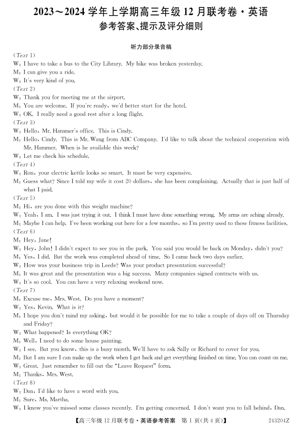 辽宁省部分学校2023-2024学年高三上学期12月联考 英语答案