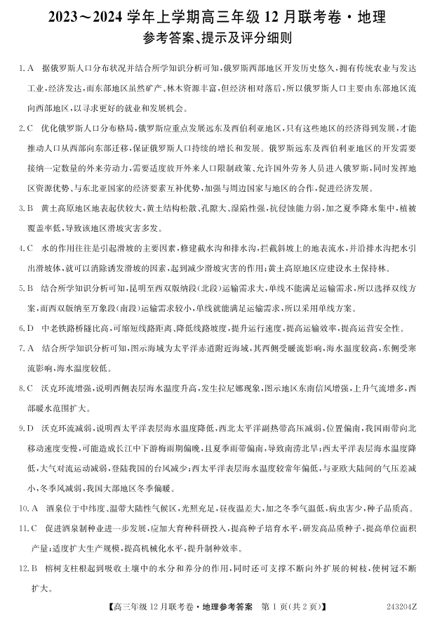 辽宁省部分学校2023-2024学年高三上学期12月联考 地理答案