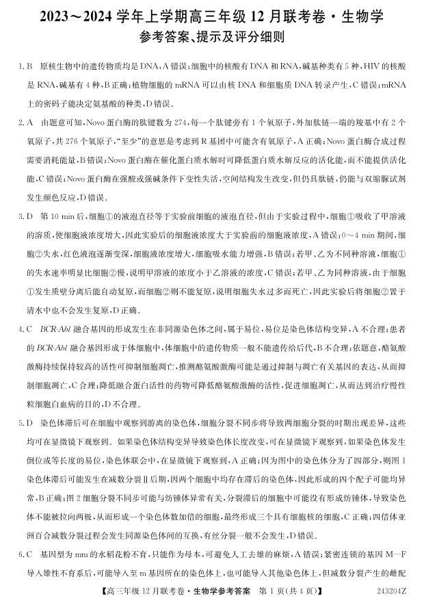 辽宁省部分学校2023-2024学年高三上学期12月联考 生物答案