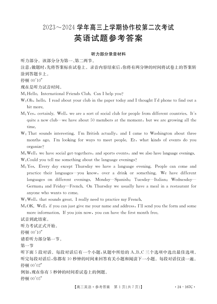 辽宁省葫芦岛市协作校2023-2024学年高三上学期第二次考试 英语答案