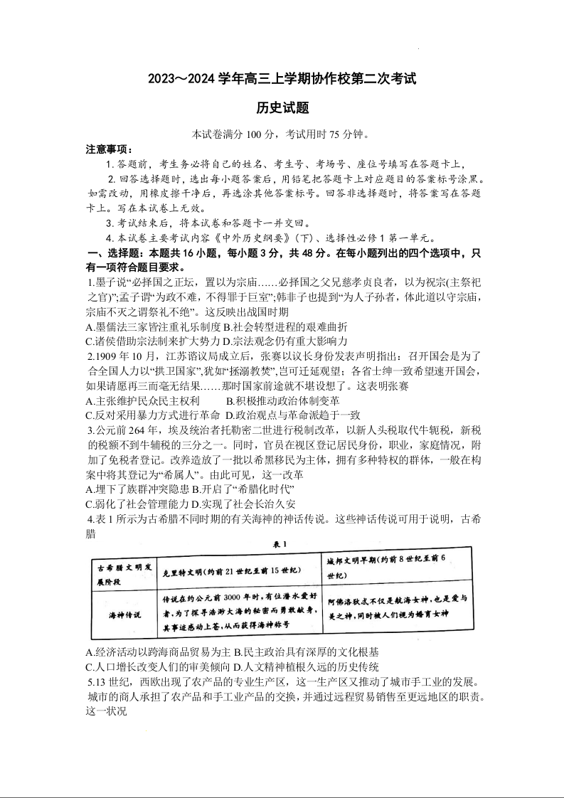 辽宁省葫芦岛市协作校2023-2024学年高三上学期第二次考试 历史