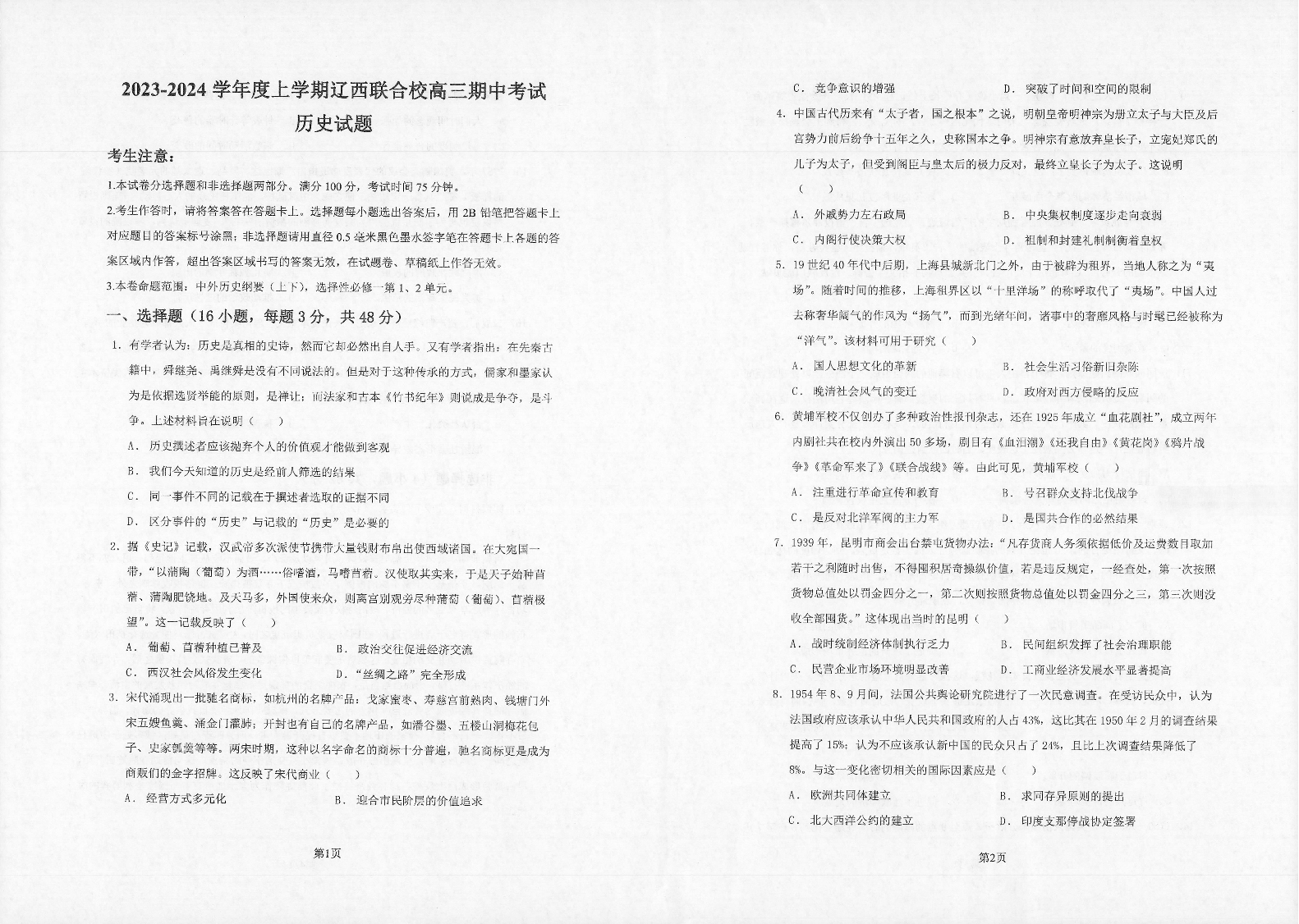 辽宁省辽西联合校2023-2024学年高三上学期期中考试 历史