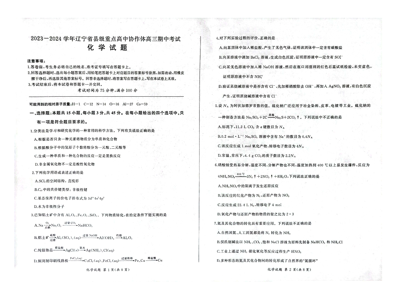 辽宁省县级重点高中协作体2023-2024学年高三上学期期中考试 化学