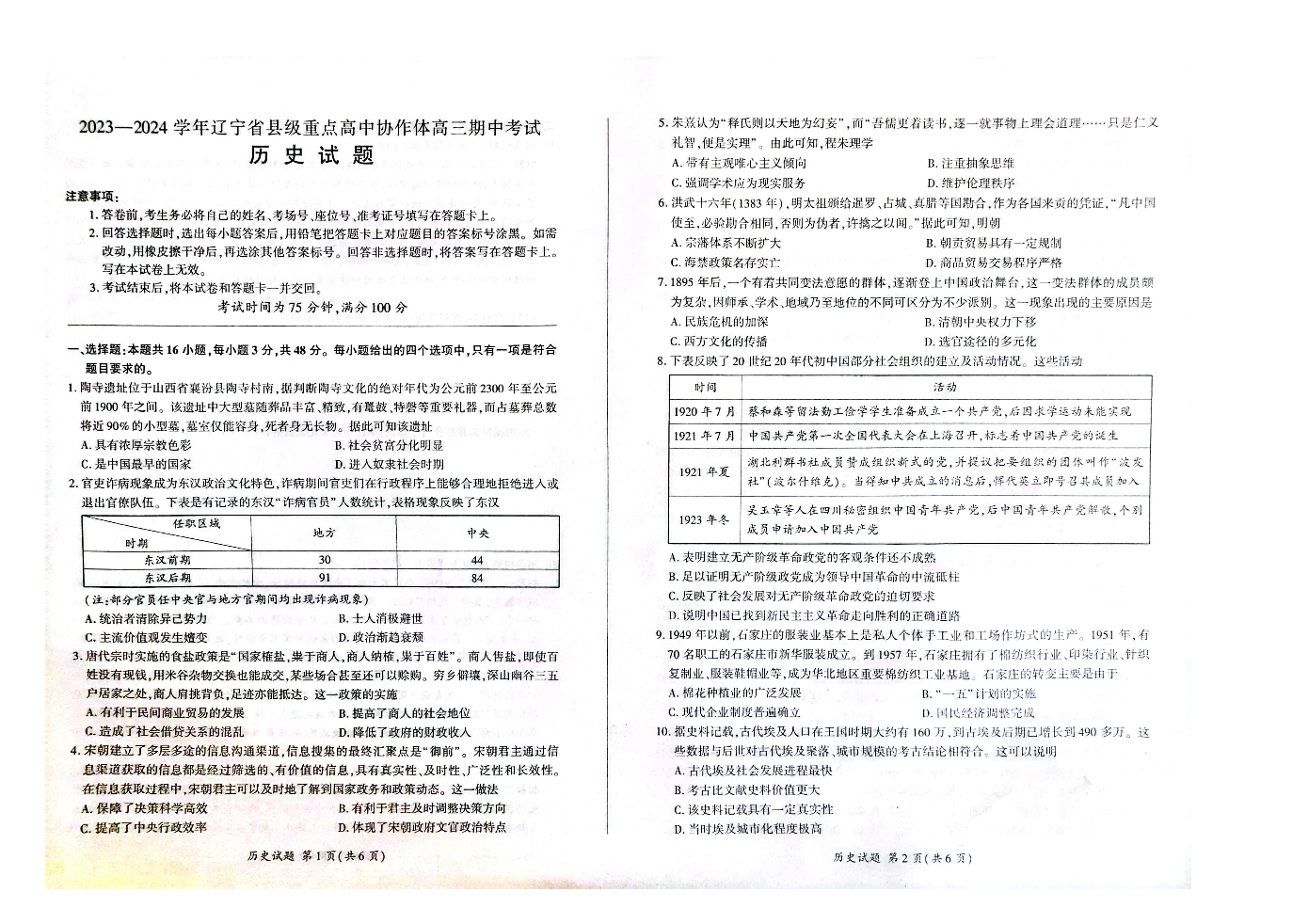 辽宁省县级重点高中协作体2023-2024学年高三上学期期中考试 历史