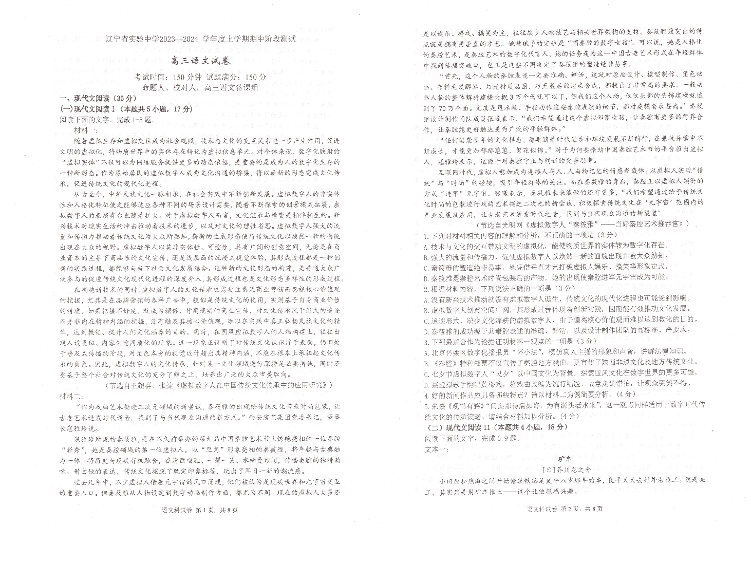 辽宁省实验中学2023-2024学年高三上学期期中考试 语文