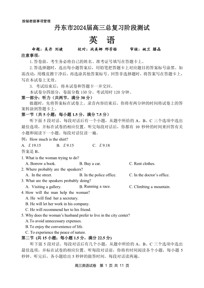 辽宁省丹东市2023-2024学年高三上学期11月阶段测试 英语