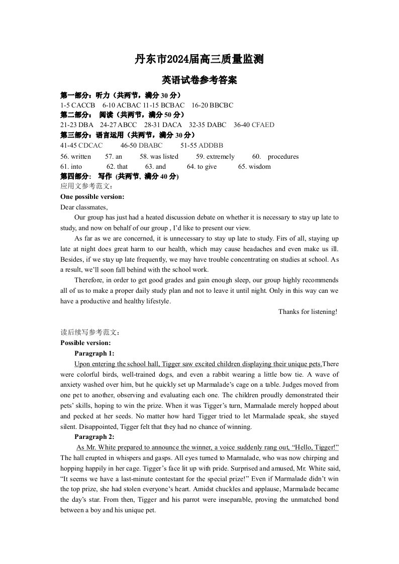 辽宁省丹东市2023-2024学年高三上学期11月阶段测试 英语答案