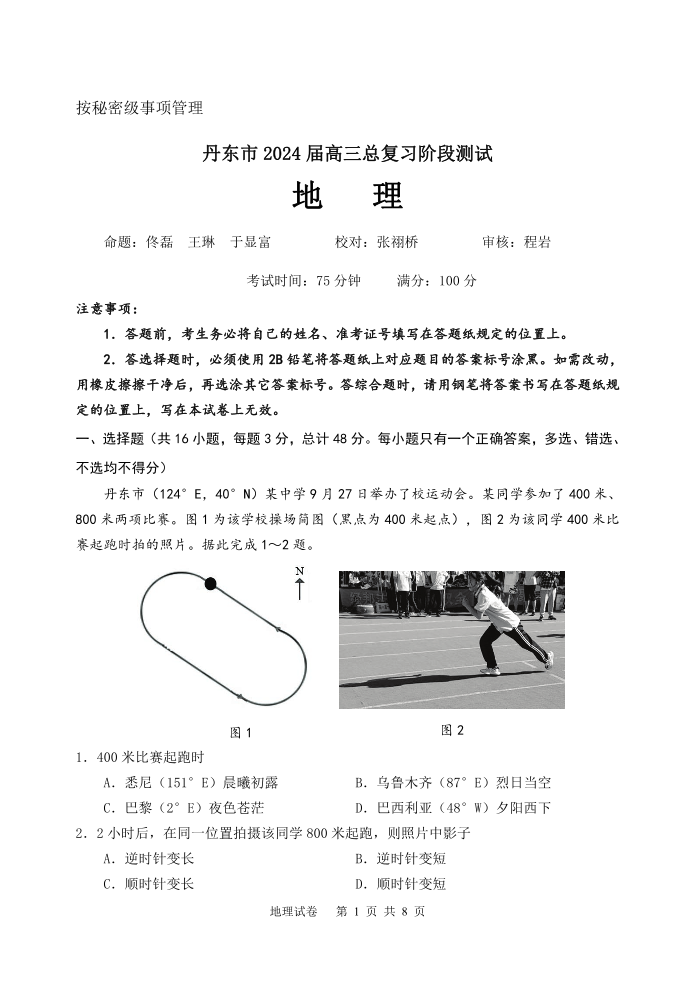 辽宁省丹东市2023-2024学年高三上学期11月阶段测试 地理