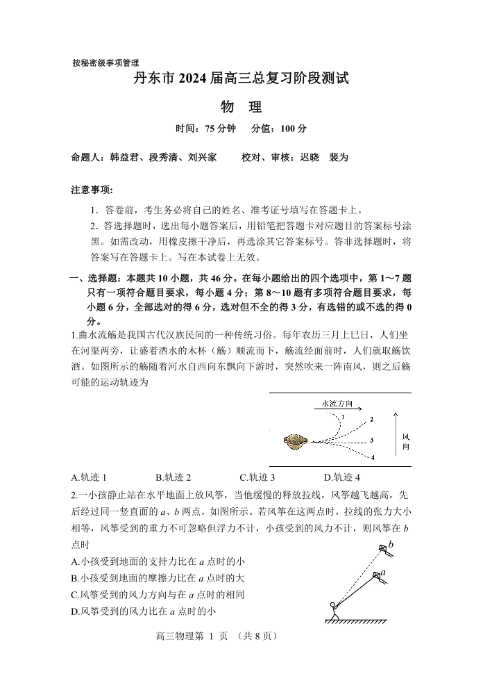 辽宁省丹东市2023-2024学年高三上学期11月阶段测试 物理