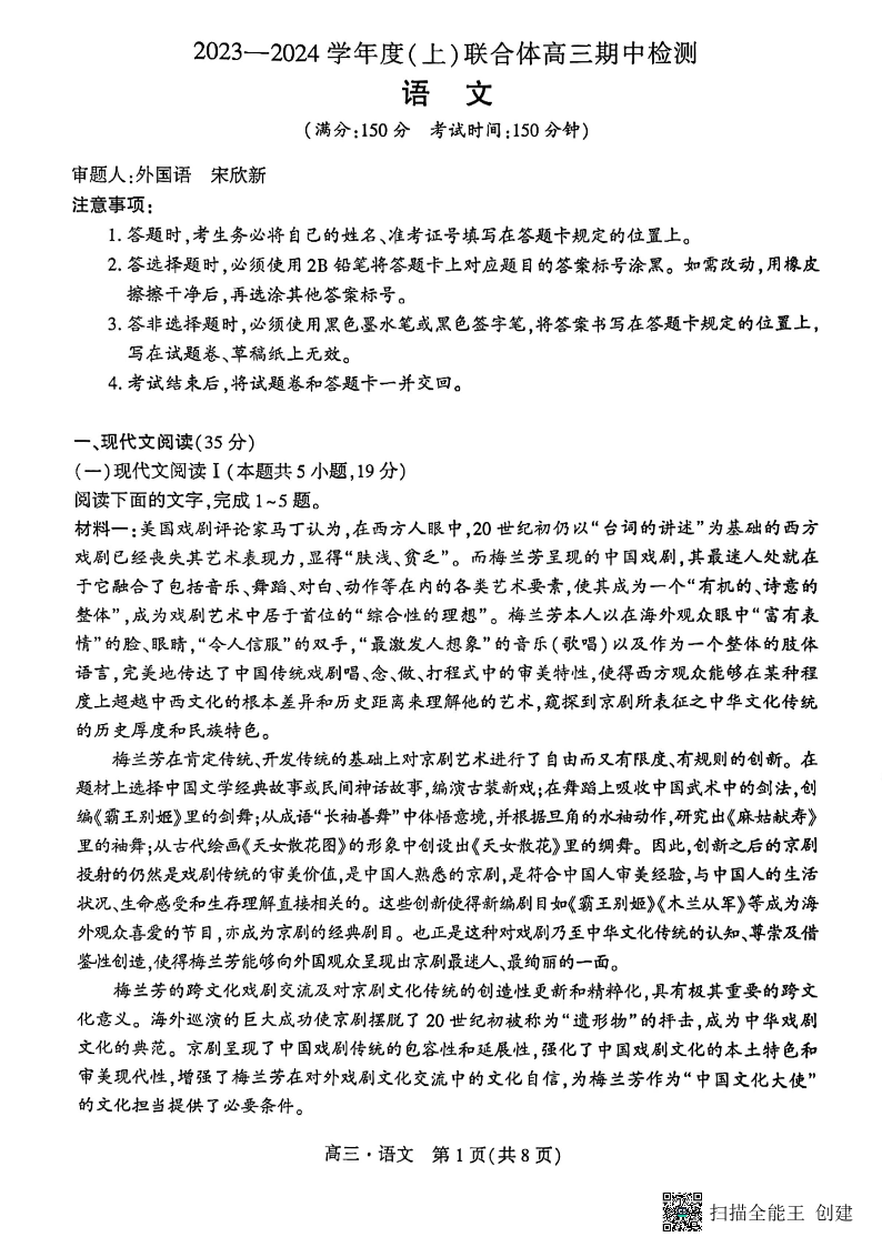 辽宁省沈阳市重点高中联合体2023-2024学年高三上学期期中考试 语文
