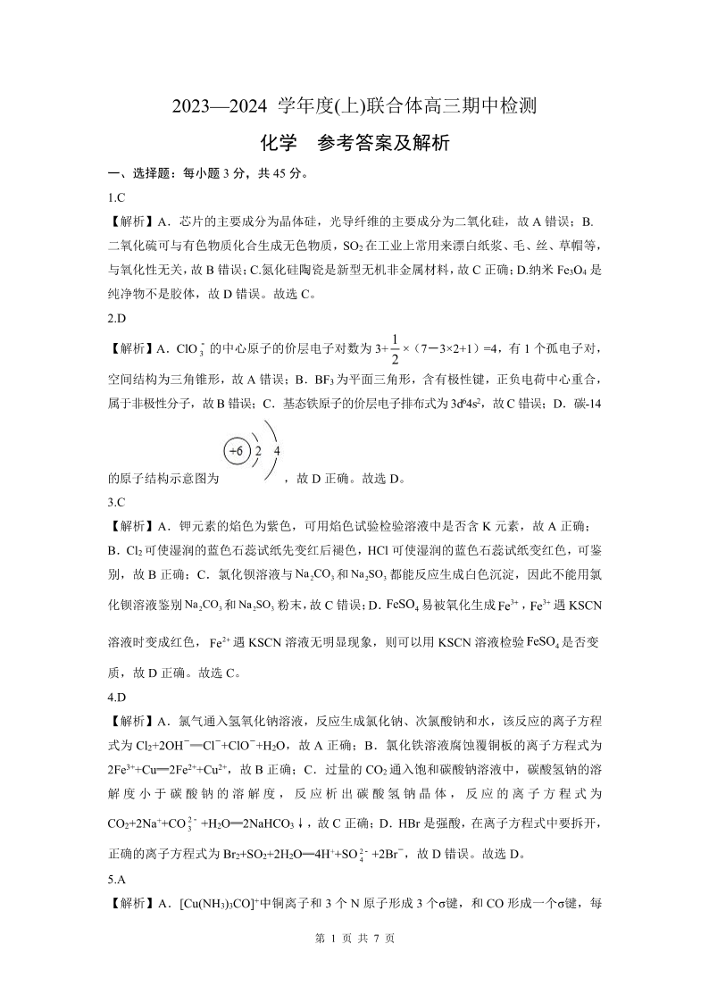 辽宁省沈阳市重点高中联合体2023-2024学年高三上学期期中考试 化学答案