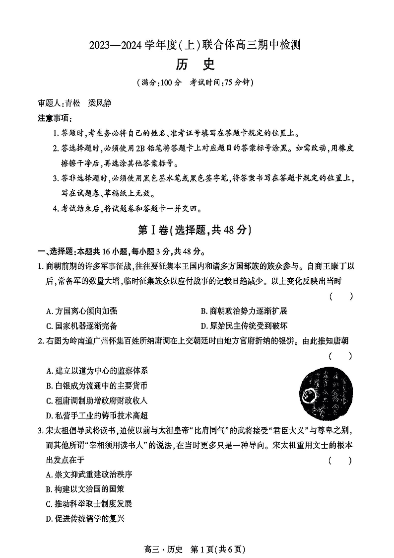 辽宁省沈阳市重点高中联合体2023-2024学年高三上学期期中考试 历史